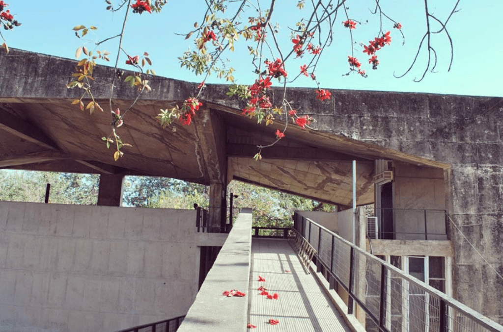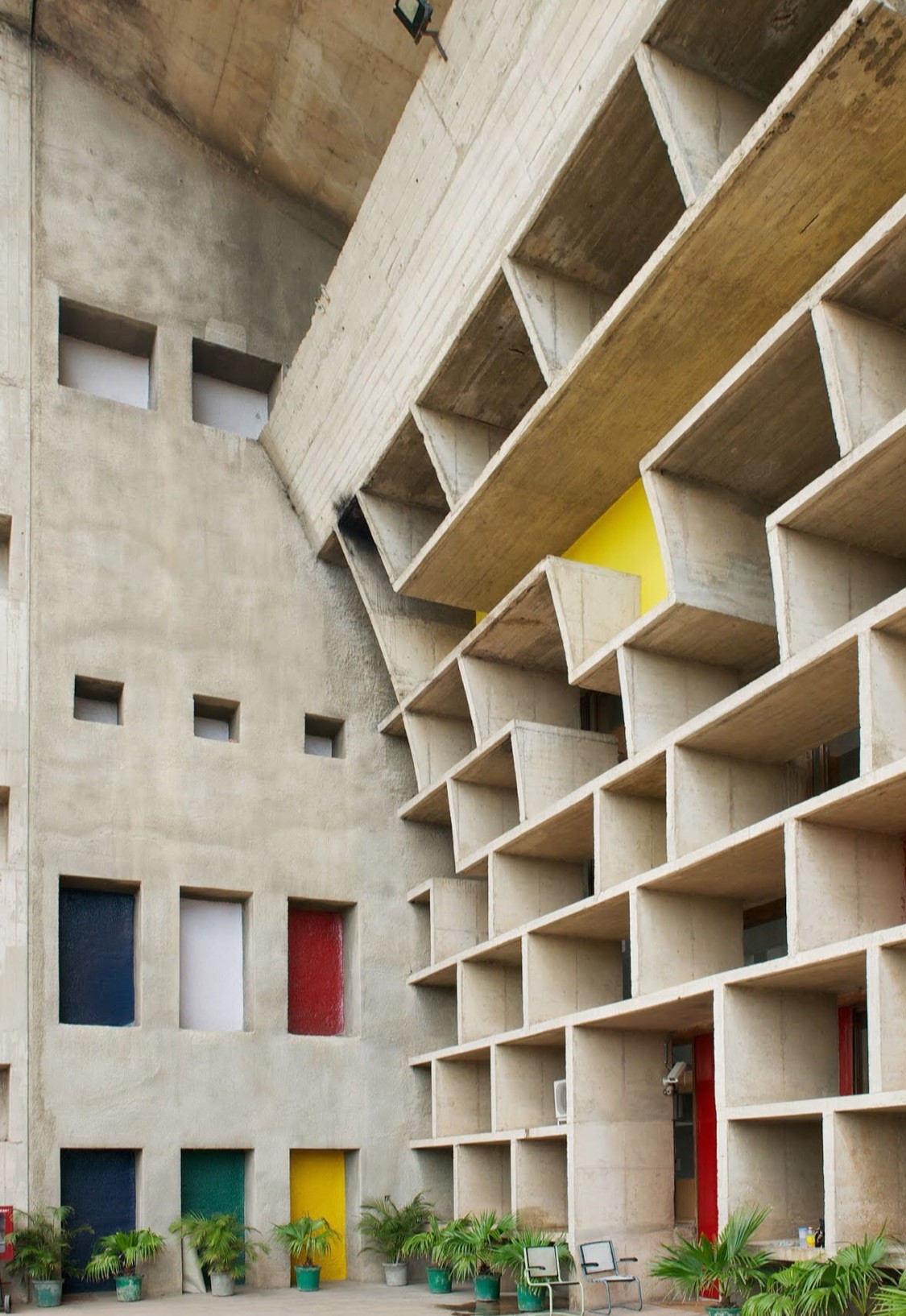 Corbusier’s buildings in the tropical climate of Chandigarh show his pact with nature. He has used the brise soleil technique to keep buildings cooler in the harsh sun by adding shade creating areas in the façade of the building while using concrete construction throughout. His signature elements of beton brut construction and brise soliel techniques are evident in the buildings he designed for the capitol complex.