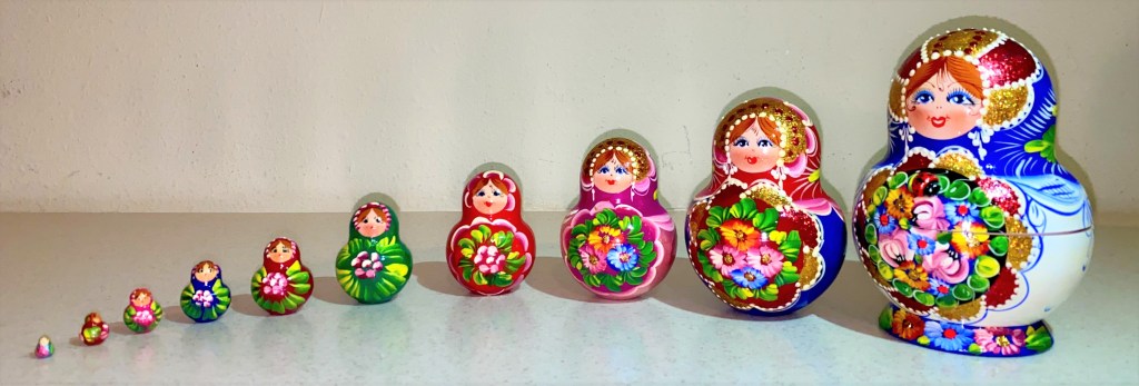 For my birthday, one of my friends gave me a set of Russian Matryoshka dolls. They are absolutely beautiful, and I love opening them one by one to take out the smaller doll from inside the bigger doll – there is something so satisfying about the smoothness with which the dolls come apart and reveal their secret – I’m not surprised they are so loved by Russians and everyone else.