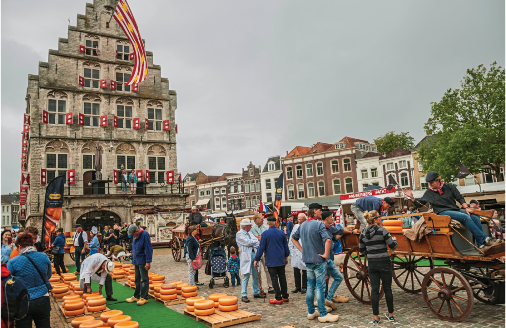 Even now, every spring and summer, the cheese market is in full swing every Thursday, where the cheese is weighed and traded in exactly the same way today as it has been for hundreds of years. The cheese wheels are delivered on house cart by farmers to the trading market in front of the town hall.  The farmers and traders settle on a price by the clapping of hands known as handjeklap – smacking each other’s hands as they negotiate the price.
