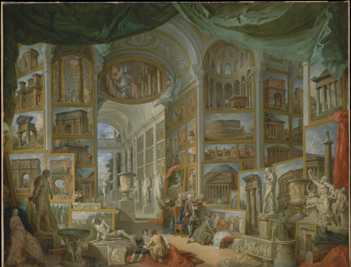 I am always fascinated by paintings that are paintings of a gallery or a viewing room – they are basically a painting of multiple paintings (similar to Rockwell’s Picasso vs. Sargent). Two of the best examples of this genre, called kunstkammer (German for “cabinet of curiosities”) are Modern Rome and Ancient Rome by Giovanni Paolo Panini (1691 – 1765)