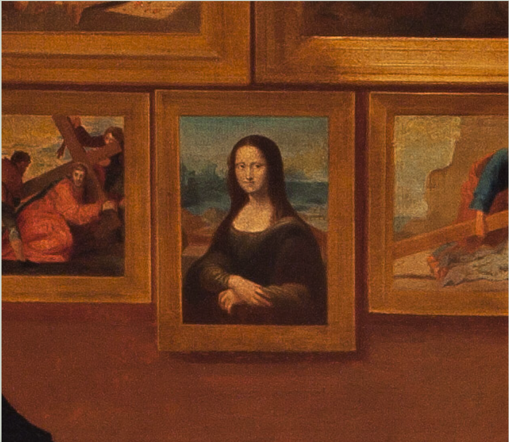 Morse arranged the paintings as he wished and probably in some order that he liked them, and altered relative sizes to fit his canvas. We can see Leonardo’s Mona Lisa and Raphael’s La Belle Jardiniere. At the bottom row of paintings – on either side of Mona Lisa- we see two versions of Christ Carrying the Cross – perhaps Morse wanted to highlight the different ways artists handled the same subject matter.