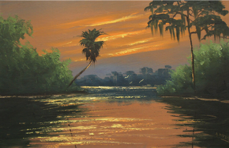 The self-taught Highwaymen worked in the Fort Pierce and Vero Beach regions of Florida and painted the diverse and vibrant ecology of the region in their own distinct style. They painted fiery red sunsets, banyan trees laden with Spanish moss, beaches, marshes, aquamarine waters, stunning palms and poinciana tress, birds in flight– all in dazzling colors, and got their name by selling these works to tourists driving along Florida’s Atlantic Coast.