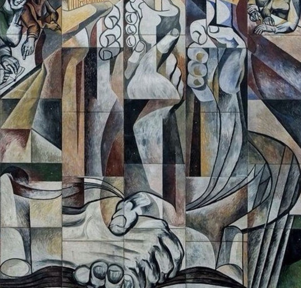 Like the mural there is no slow progression to the surface or depth perception – natural shapes are lost and only representational motifs remain – more so in the Braque than the mural – but the similarities are striking and exciting. Another fragmented work – The Portugese (1911), shows the fractured forms of a musician and his guitar.