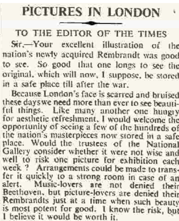 “because London’s face is scarred and bruised these days we need more than ever to see beautiful things. Like many another one hungry for aesthetic refreshment, I would welcome the opportunity of seeing a few of the hundreds of the nation’s masterpieces now stored in a safe place. Would the trustees of the National Gallery consider whether it were not wise and well to risk one picture for exhibition each week? Arrangements could be made to transfer it quickly to a strong room in case of an alert. Music-lovers are not denied their Beethoven, but picture-lovers are denied their Rembrandts just at a time when such beauty is most potent for good.”