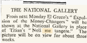 The first painting selected by the museum was Titian’s Nole me tangere. The picture with its biblical subject matter that invited contemplation and its themes of Christ’s sacrifice for humanity, seemed like a perfect choice for a nation at war. The picture was selected on March 11, 1942 and was on display for three weeks.