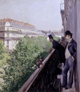 This gave me the idea for today’s blog – people in their balconies watching life go by – sometimes wistfully, sometimes happy to be onlookers, sometimes to connect with the outside world, sometimes to disconnect from the world, sometimes spying on others – and occasionally being spied on by others – like in Caillebotte’s woman looking at and at the same time being looked at by another woman on a balcony across the street!!