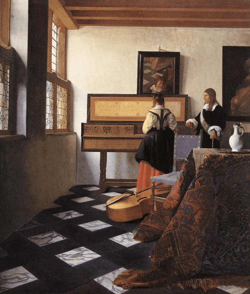 The soft morning light is diffused over silken curtains as a woman reads a letter, it guides the milkmaid as she pours milk from her pitcher, the strong mid-day sun adds to the beauty of the woman as she flirts with the man in the dark hat, it lights up the globe for the cartographer as he examines the finer details in his maps, and illuminates the balance beam as the lady ponders her material and spiritual wealth.