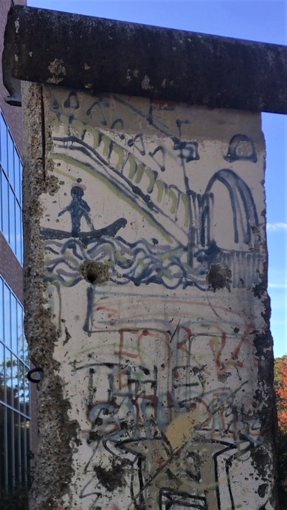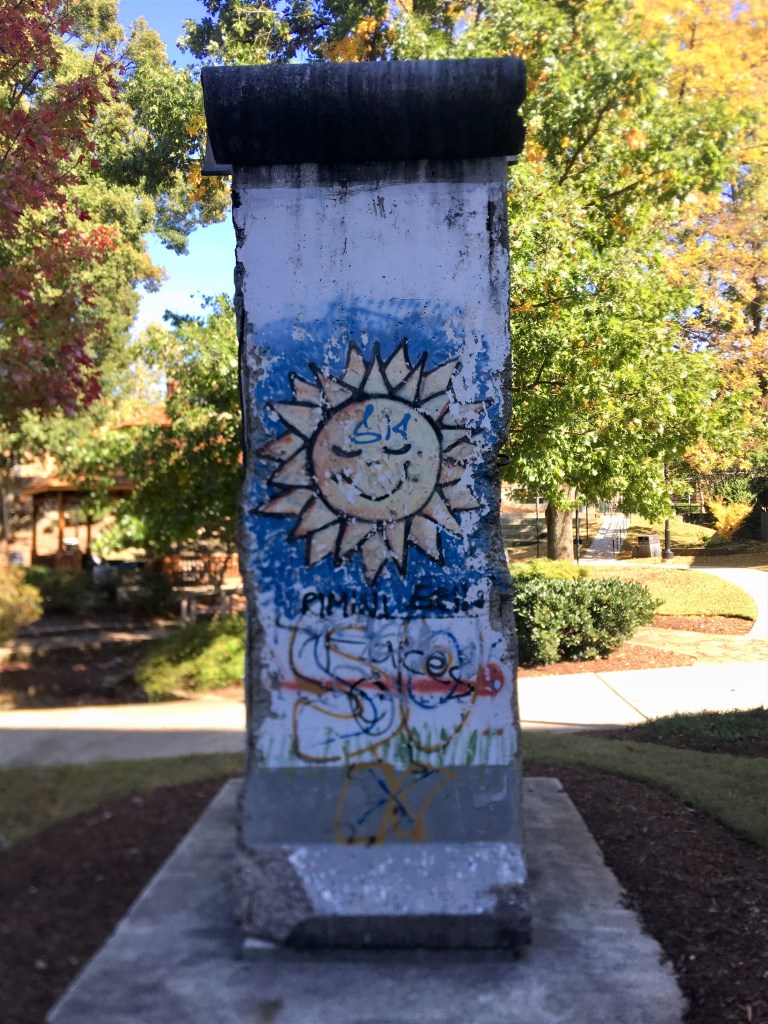 Thousands of miles away from Berlin, in the most unexpected place – in the peaceful and leafy campus of Kennesaw State University campus there is a piece of Berlin history. A section of the wall, with a particularly cheerful graffiti lies on this campus. Well, perhaps not completely unexpected because I’ve realized that Georgia has quite a few sections of the wall. Apart from the one on the KSU campus, there is one in Suwanee (which I wrote about previously), there’s one at the Atlanta International School (I am so envious!!), the National Infantry Museum in Fort Benning has three sections of the wall on display in their Cold War gallery, and Freedom Park in Fort Gordon has two sections of the wall on display.