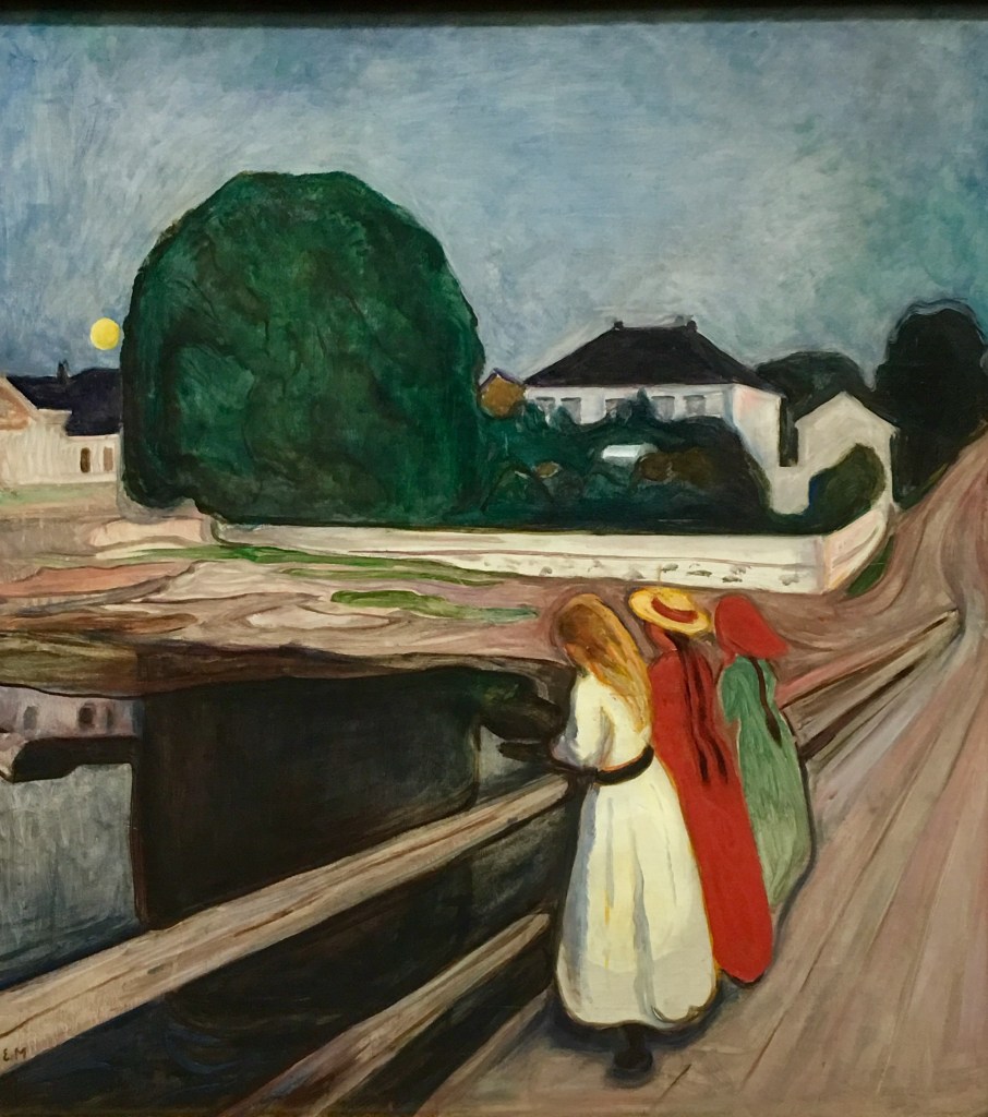 Munch painted his sister Inger in his first full-length portrait. She stands in isolation between the ethereal blue of the wall and the earthy floor. He painted many versions of the bright and contemplative Girls on the Bridge, which despite its poetic composition is a literal translation of a scene in the town of Aasgaardstrand, Norway.
