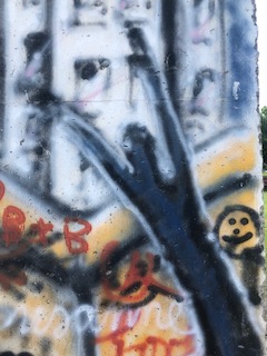 I spend hours with the images of Berlin Wall graffiti that I find online. I zoom into the images, read the messages, and find connections. One prominent writing in red says “27.86 HHS of Moorburg,” which is a neighborhood in Hamburg, West Germany. Below that in black, “FACIST PROTECTION WALL,” and to the left, a black heart with the words, “From Russia With Love.” The black and white image has the words, “Realitat,” which is the German word for facing facts. A German fan pays homage to a favorite band – Raga Rockers 83 – a Norwegian band that recorded their first album in 1983. In Italian a “Viva Librealismus,” while a German “Mu̇ll” – which suggests to throw something in the trash – quite apt for what most Berliners wanted to do with the wall. There’s a rocket with the word USSR on it, and what seems to be Reagan 60 written next to it. To the right, what I’m sure was a powerful antiwar sentiment – unfortunately the tree is covering some of the letters.