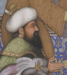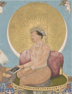 Jahangir – the second Mughal emperor of India was the son of the Great Akbar is seen seated on an hourglass throne. Jahangir liked to be glorified in paintings, and was responsible for the flourishing of Italian Renaissance style painting in his court. Jahangir has a halo of both the sun and moon behind his head, which symbolizes his exalted status.
