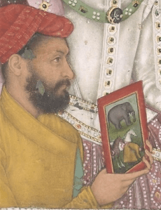Self-portrait – The person closest to us (who ironically is the smallest) is the artist himself who has forgone perspective for the sake of aggrandizing his patron Jahangir. That Bichitr had been influenced by Italian Renaissance perspective is evident from the small portrait within the portrait in which he has painted himself with two horses and an elephant (all gifts to him from Jahangir). He shows his utmost gratitude to Jahangir by bowing deeply before his king. The portrait within the portrait is made with depth perspective and shows the artist’s skill and the influence of Italian techniques in his work.