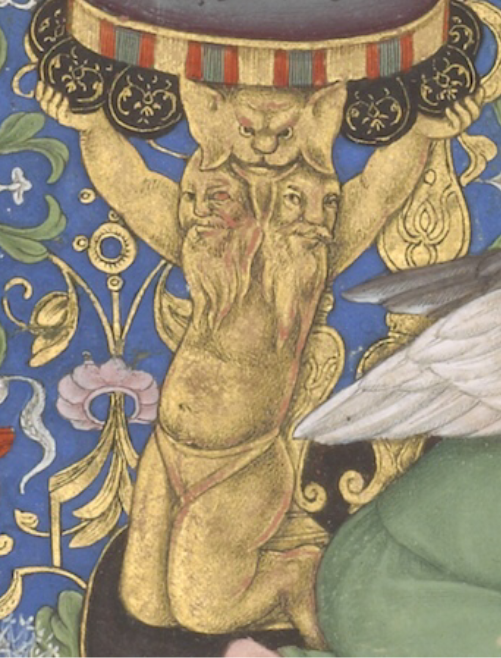 A connection with Europe is seen in the hourglass which was a European invention. It has been painted from a gold hourglass that was most likely brought to the court in 1584 by an English goldsmith William Leedes. Similar European hourglasses from this period are found in museums across Europe. Two cupids (puttos) at the base of the hourglass are a direct influence of Christian iconographic devices in European art. Another European influence is the grotesque looking three headed figure at the base of the footstool that is eerily reminiscent of gargoyles.